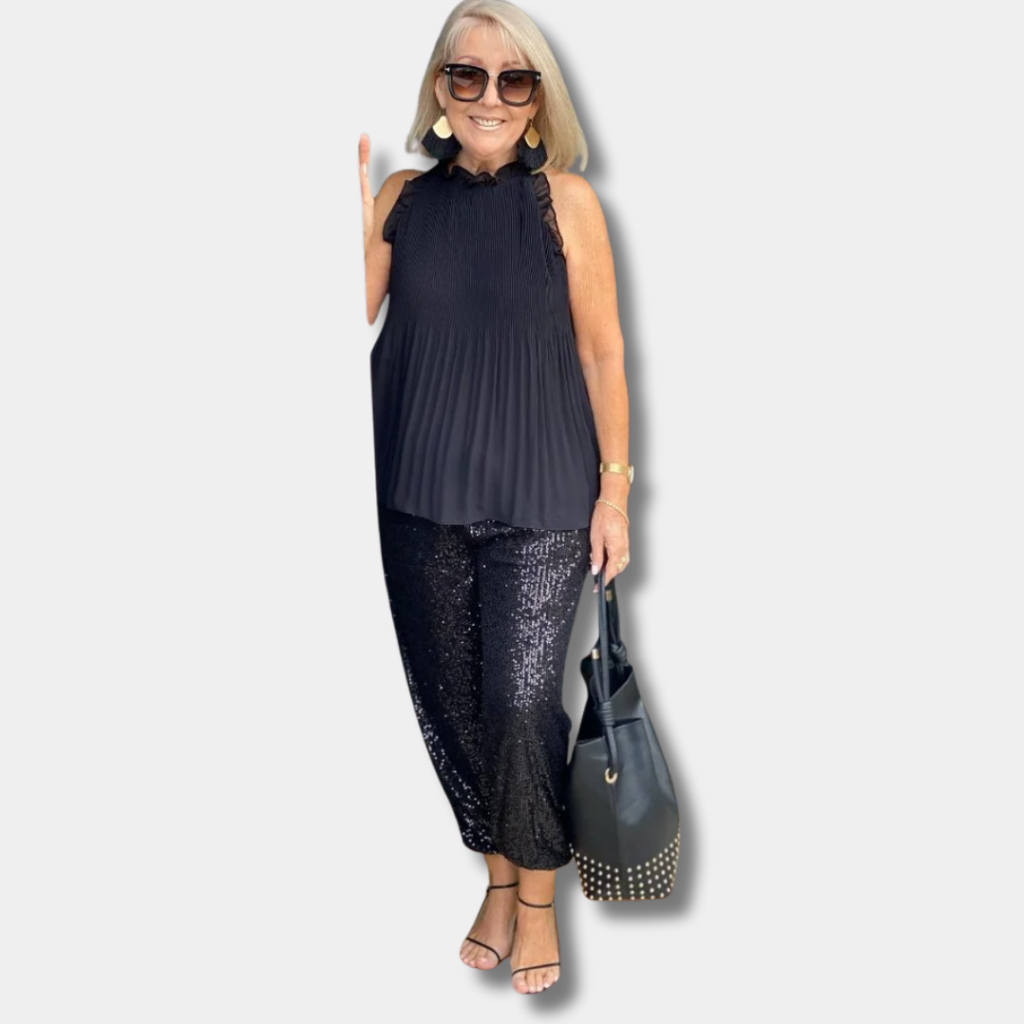 Step into shine with the Aria Set—a two-piece look that blends head-turning style with feel-good comfort. With its softly sleeveless top and sleek ankle-length pants, this outfit flows over your shape without clinging, so you always feel confident and at ease. The relaxed fit offers gentle tummy coverage and easy movement—perfect for dinner dates, celebrations, or any moment you want to glow with grace.