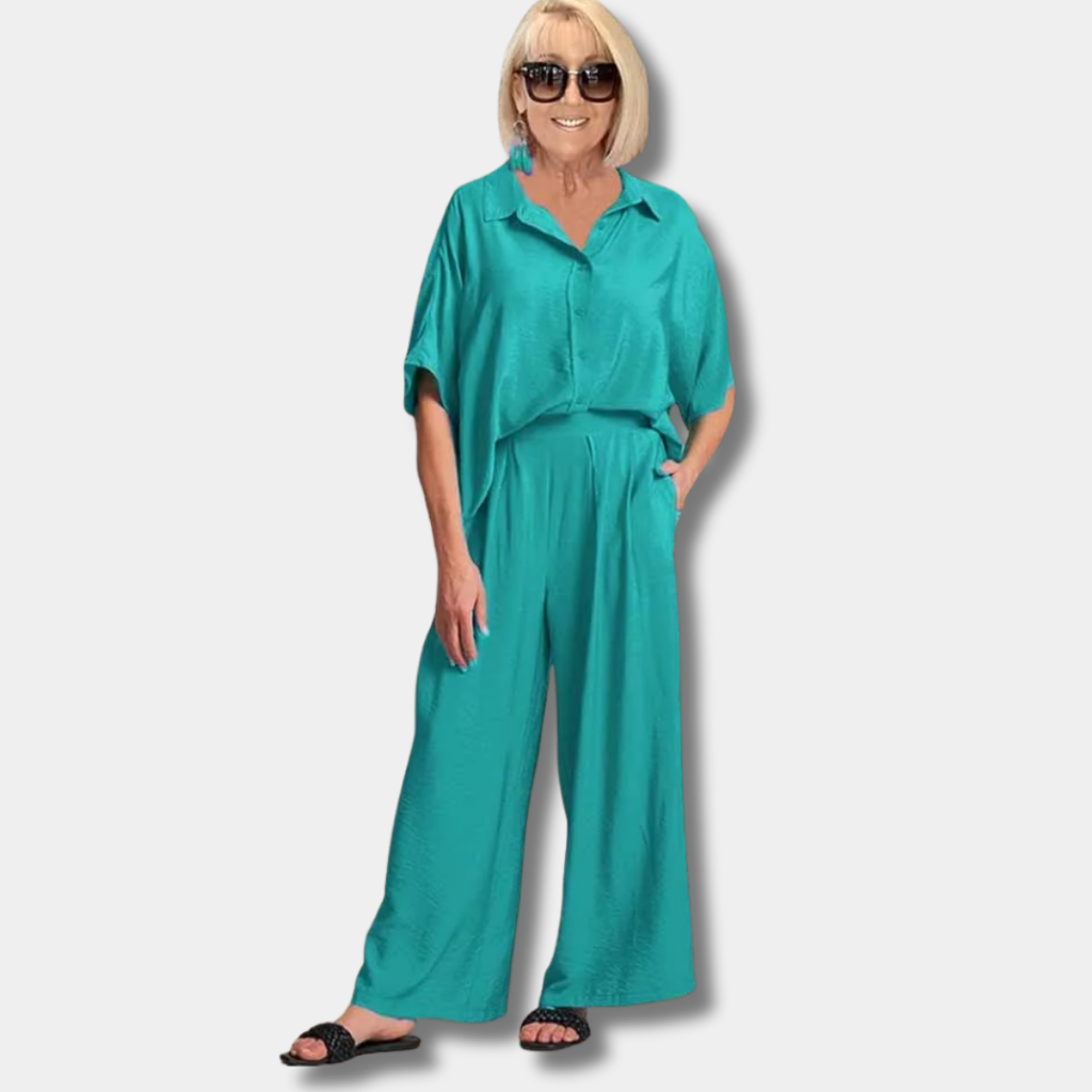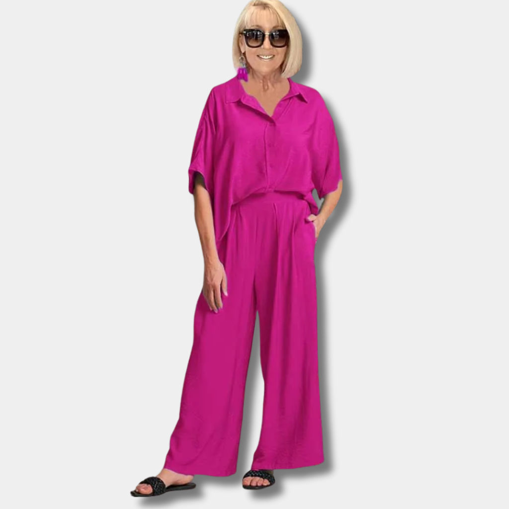 Step into laid-back polish with the Camille set—a breezy two-piece outfit designed to keep you feeling comfortable and confident all day long. The relaxed shirt-style top pairs with wide-leg, high-waisted pants featuring a soft, stretch-back waist for easy movement and light tummy coverage. From morning errands to afternoon strolls, Camille is made to move with you—no cling, no fuss.