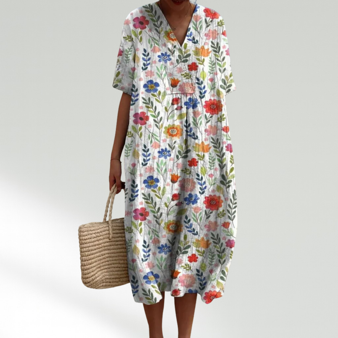Step into relaxed charm with the Cassandra Dress — a light and airy favorite designed for real-life ease. Made for sunny mornings and spontaneous plans, this floral dress flatters your shape with a forgiving fit that never clings. The soft, breathable fabric keeps you cool and comfortable through coffee runs, errands, or catching up with friends.