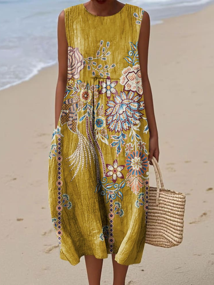 Step into effortless charm with the Ellie Art Print Dress — a soft, easygoing piece designed to brighten your wardrobe. Made from lightweight, breathable fabric that never clings, Ellie keeps you cool and confident through every warm-weather day. Its expressive print and relaxed fit add a touch of personality, while the sleeveless shape and flowy silhouette let you move freely and feel pulled together with ease.