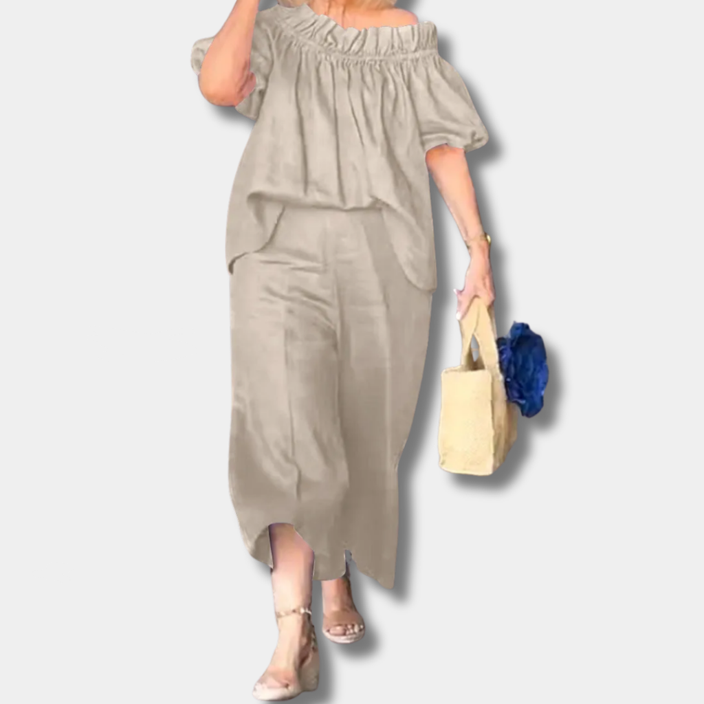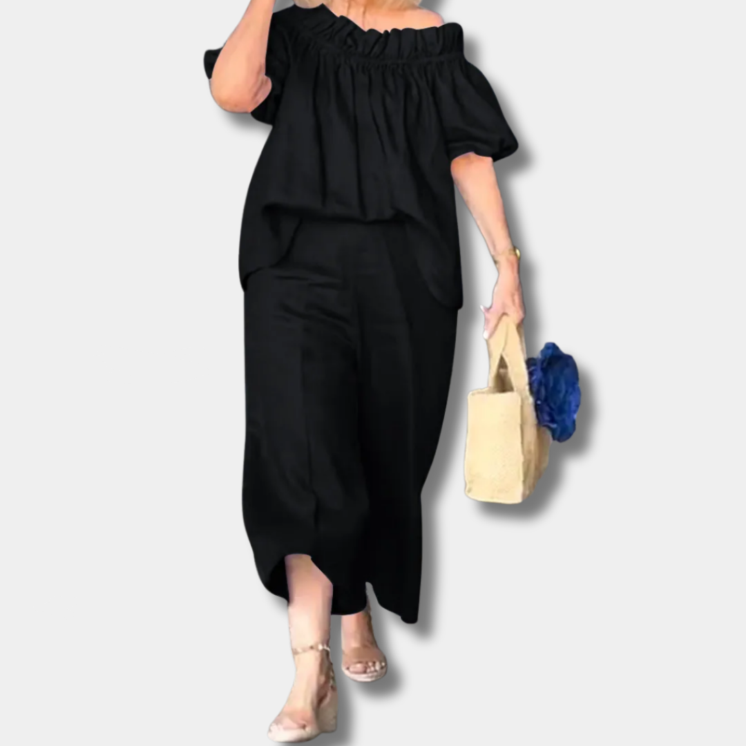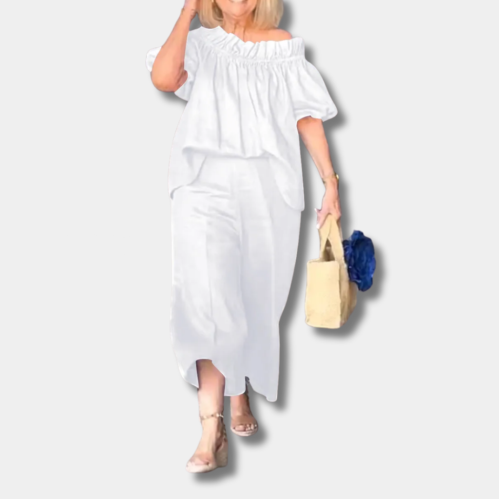 Step into breezy charm with the Janelle set—a flattering two-piece combo designed for confident comfort and easy movement. With its off-shoulder ruffle neckline and soft, breathable fabric, this look skims your shape without clinging, giving you graceful ease from morning errands to afternoon coffee or relaxed vacation days. It’s the effortless set you’ll reach for when you want to feel light, lovely, and perfectly put together—no matter where the day takes you.