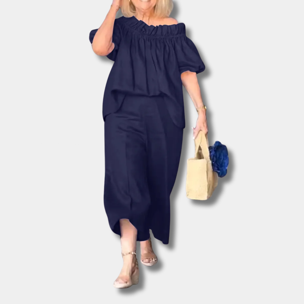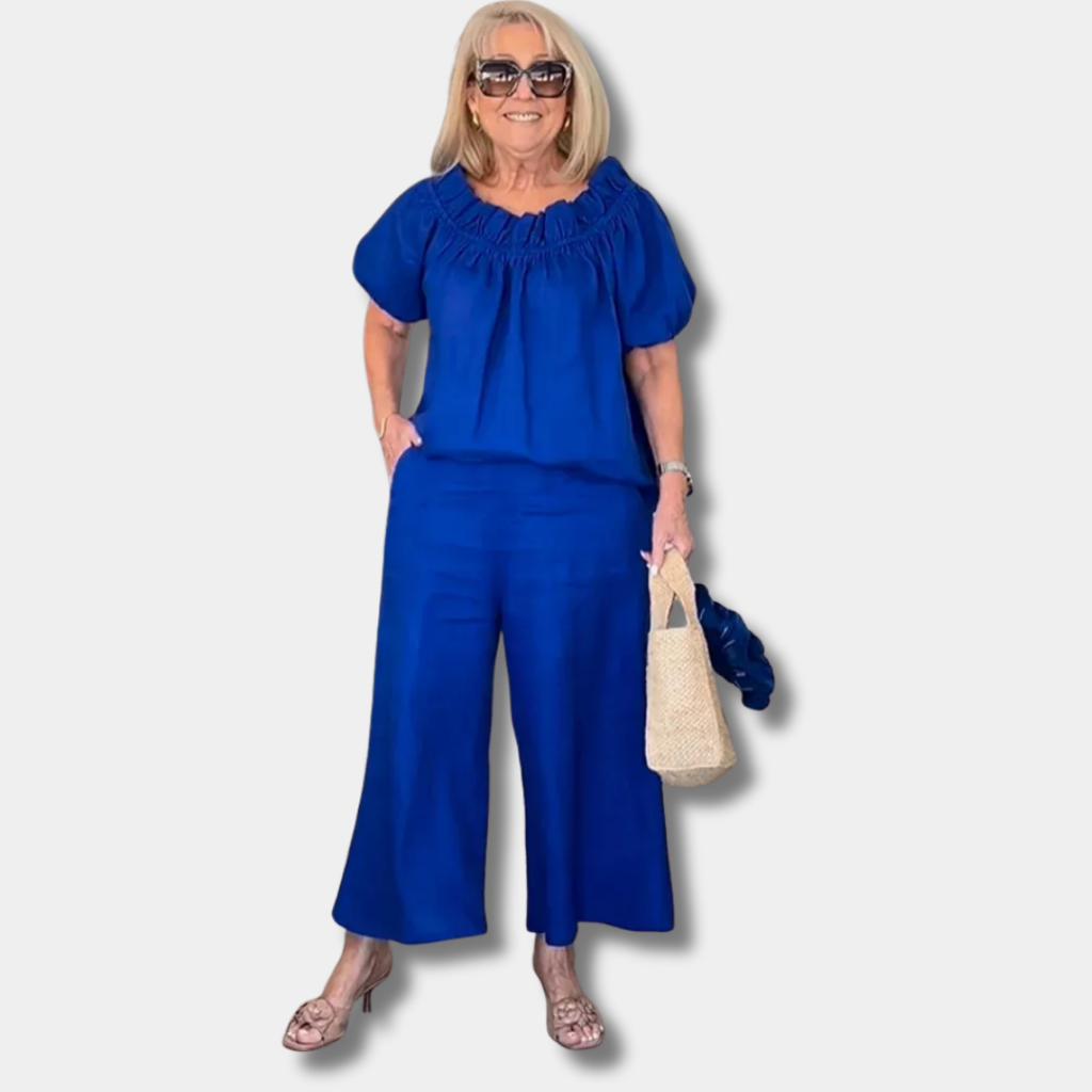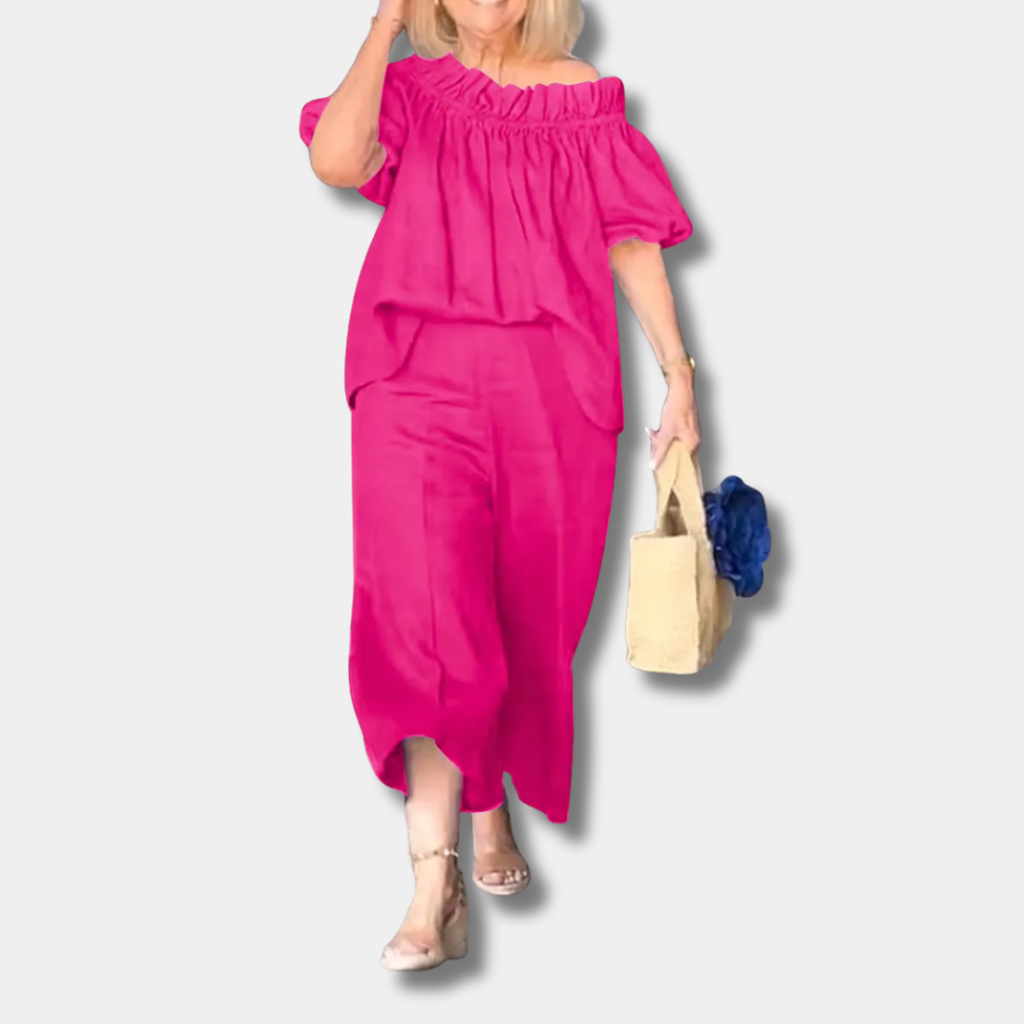 Step into breezy charm with the Janelle set—a flattering two-piece combo designed for confident comfort and easy movement. With its off-shoulder ruffle neckline and soft, breathable fabric, this look skims your shape without clinging, giving you graceful ease from morning errands to afternoon coffee or relaxed vacation days. It’s the effortless set you’ll reach for when you want to feel light, lovely, and perfectly put together—no matter where the day takes you.