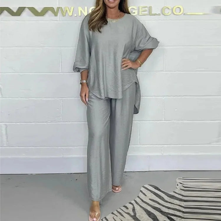 Step into easy comfort with this two-piece set. The long-sleeve top and wide-leg pants drape gently without clinging - offering light tummy coverage and all-day ease. With soft fabric and a relaxed silhouette, this look flows with your every move—perfect for coffee catch-ups, quick errands, or casual evenings where style meets comfort.