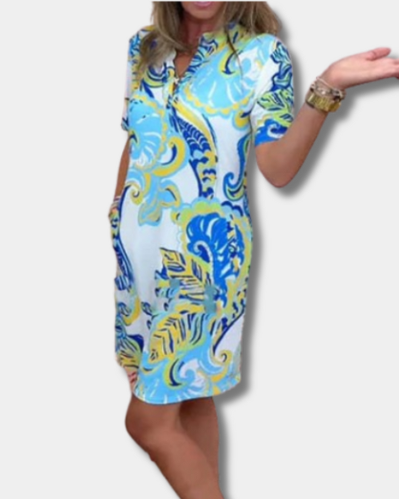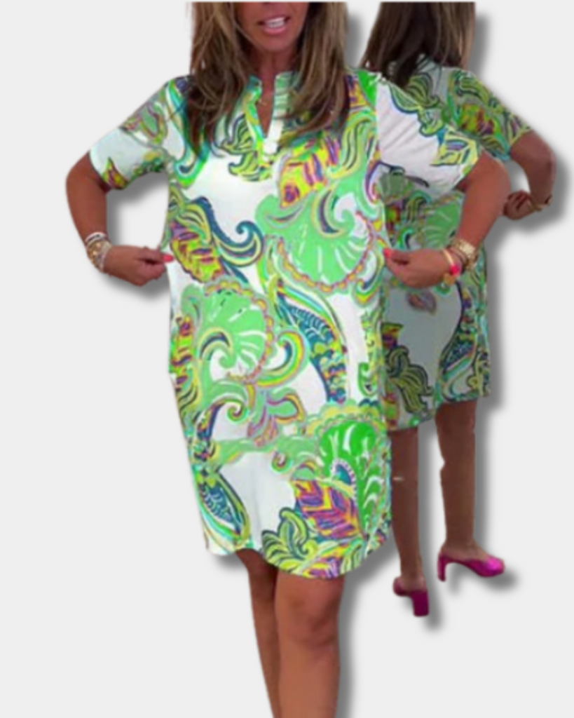 Step into effortless elegance with this printed V-neck dress designed to brighten your day without clinging to your curves. With its soft, breathable fabric, flattering knee-length cut, and gentle tummy coverage, it keeps you cool and confident from morning coffee to afternoon errands. Whether you're dressing up or keeping it casual, this easygoing beauty brings together vibrant style and everyday comfort - no fuss, just you at your best.