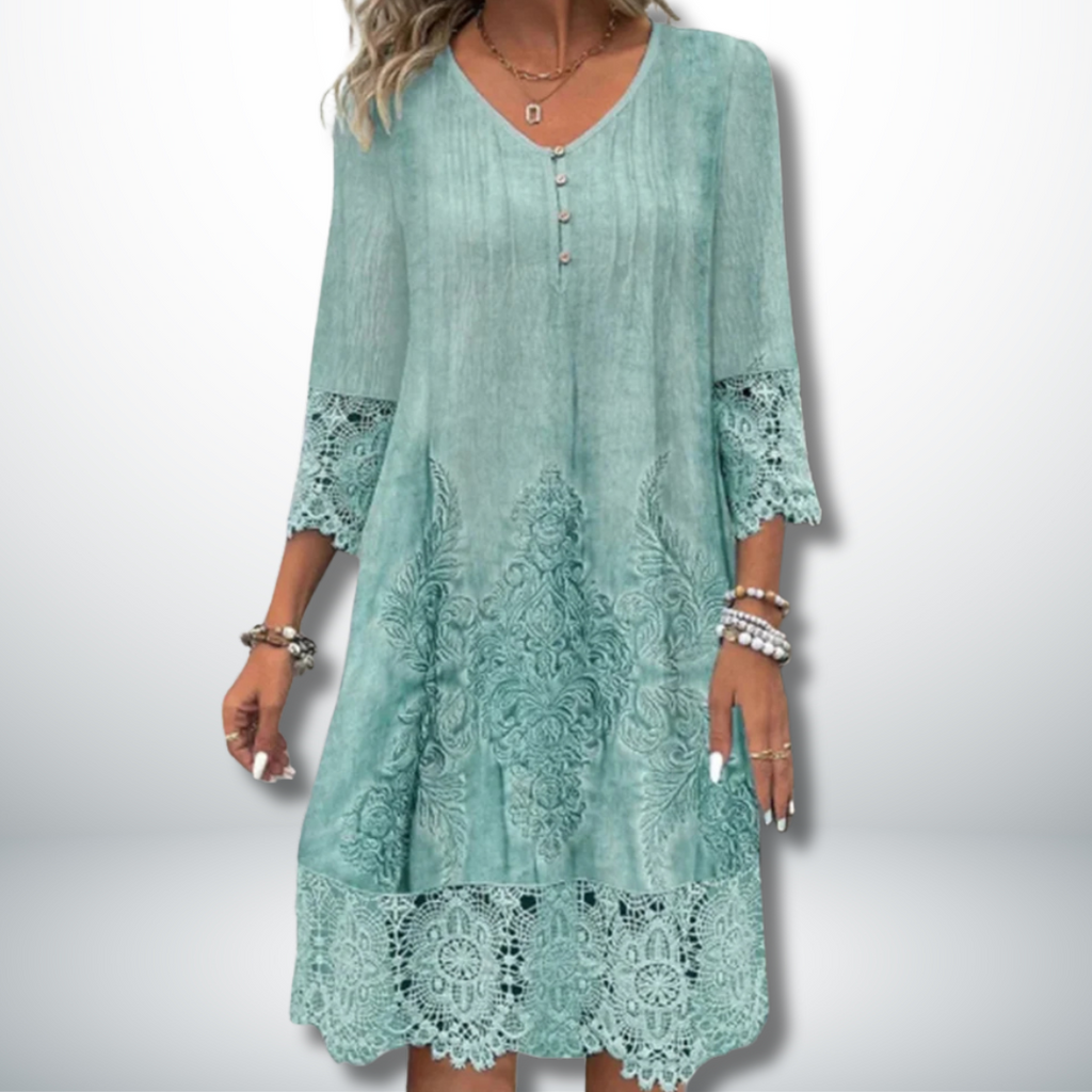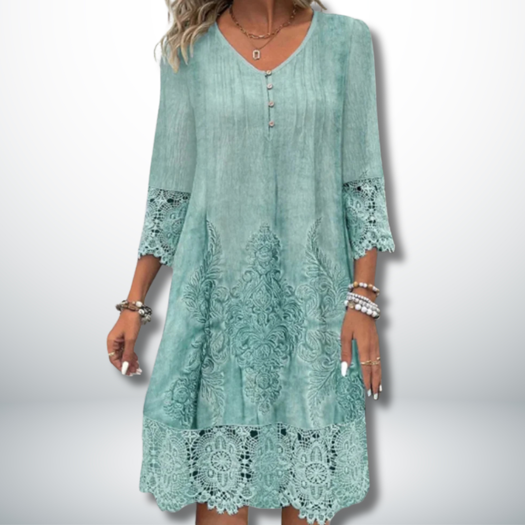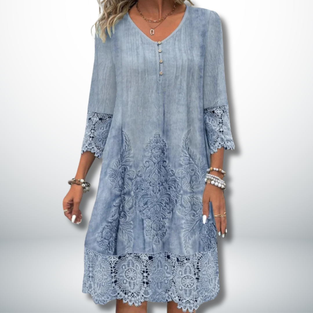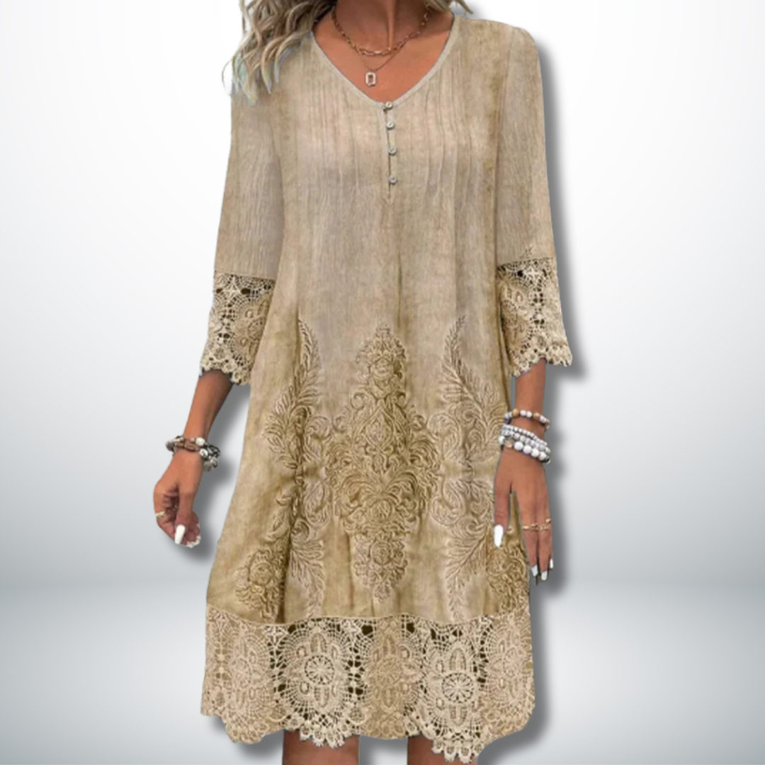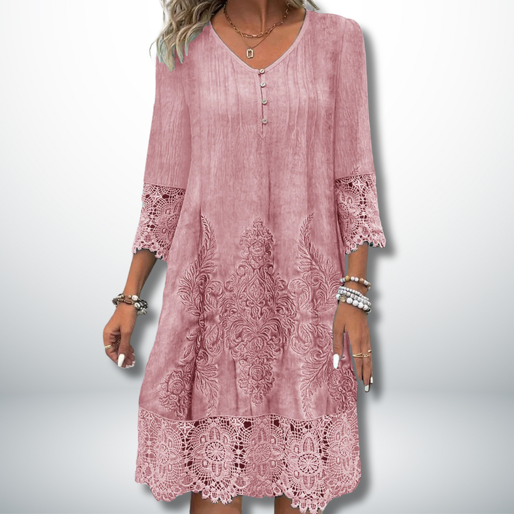 Step into quiet charm and graceful flow. Thoughtfully designed for comfort that lasts all day, the Monique Dress offers a soft, feminine silhouette with delicate lace accents and slightly longer sleeves that flatter with ease. With its breathable fabric and gentle button detail, it keeps you cool, confident, and comfortably elegant—no matter where the day leads.