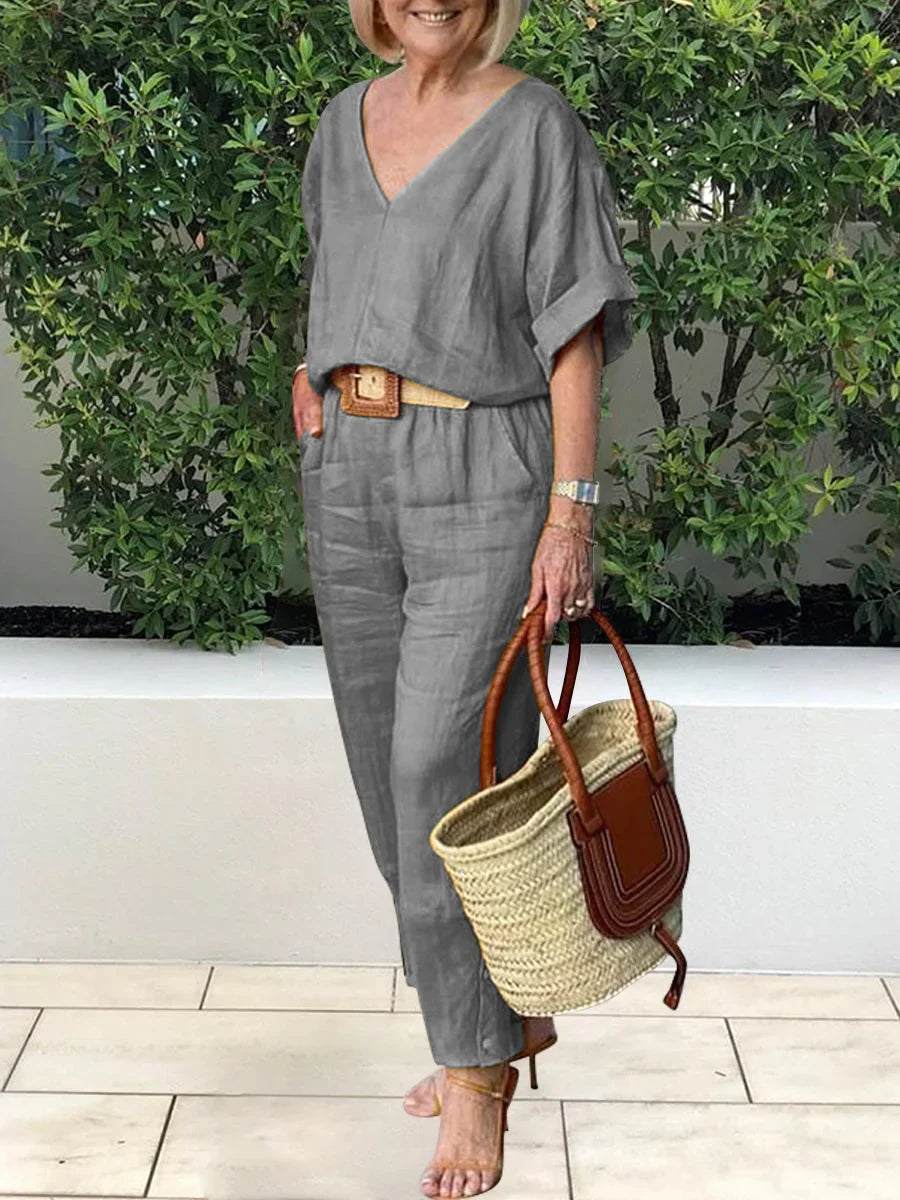 Step into relaxed confidence with this effortless two-piece set, designed for everyday comfort and casual charm. With a flattering V-neckline, soft short sleeves, and breezy long pants, it offers gentle tummy coverage and breathable ease that moves with you, without clinging. Whether you're heading out for errands, catching up over coffee, or lounging in style, Nadia keeps you polished and comfortable all day long.