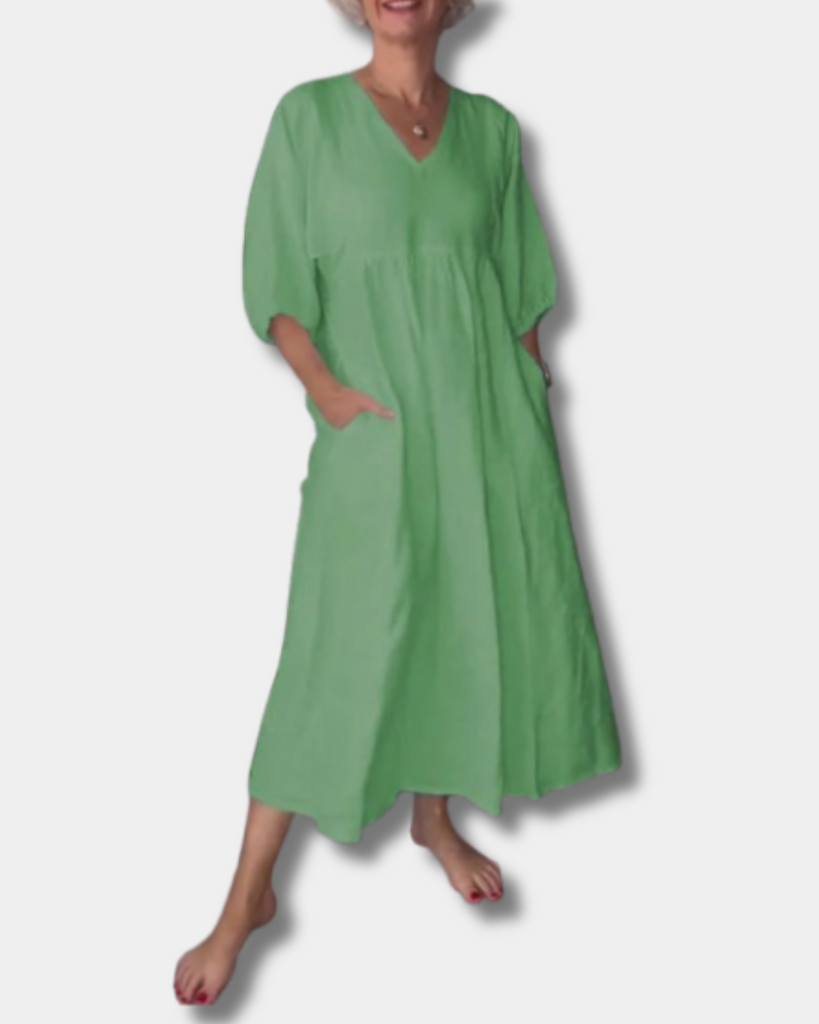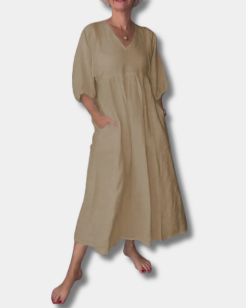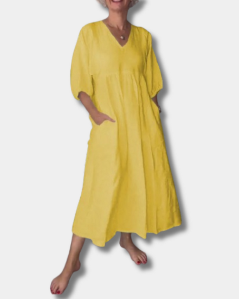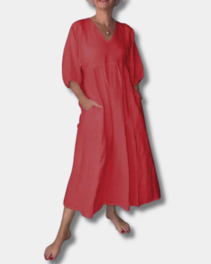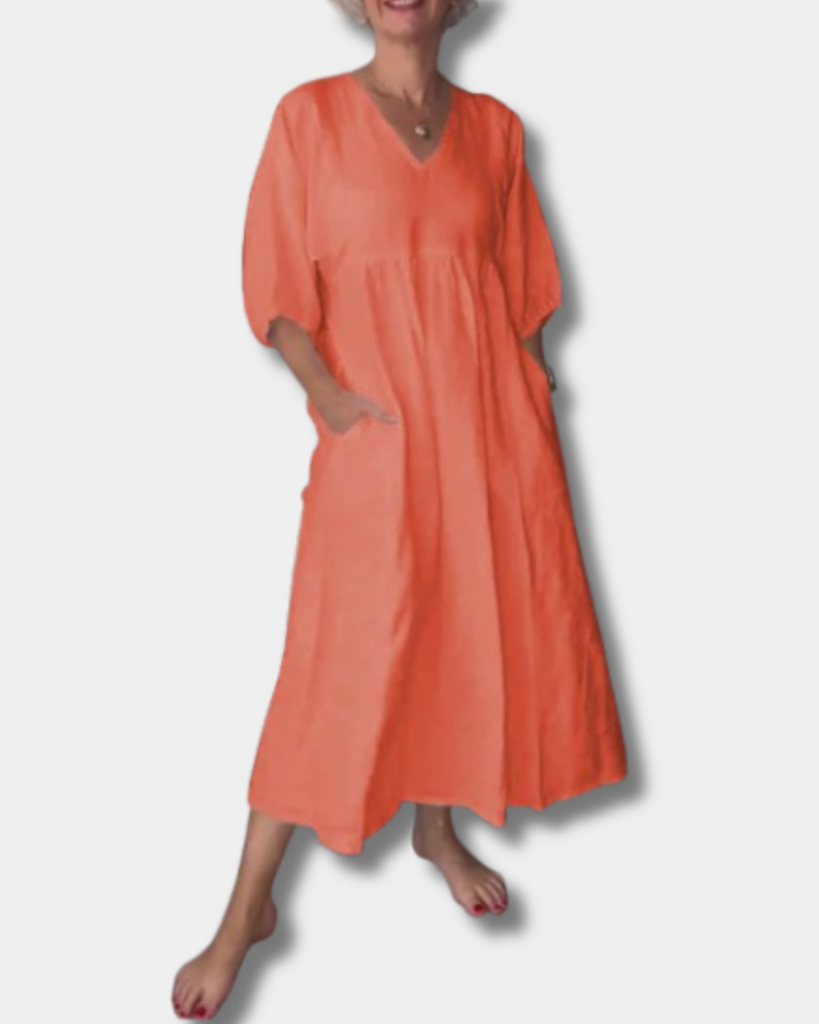 Step into laid-back style with the Sammy Dress – a soft, breathable piece designed for women who love comfort without compromising on charm. With a flattering V-neck, mid-length sleeves, and a relaxed silhouette that gently skims your curves, it flatters your natural shape without feeling tight. Perfect for coffee runs, lunch dates, or weekend getaways, this dress is easy to wear, easy to love, and made for real life.
