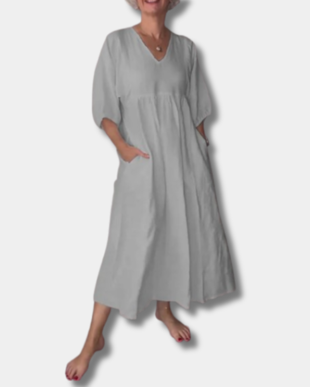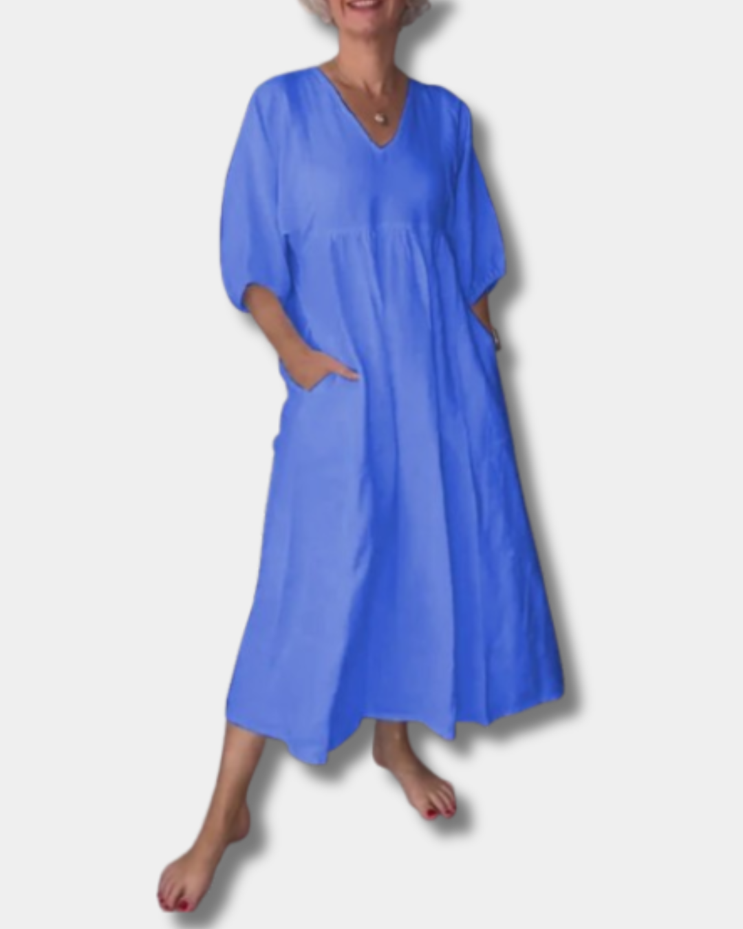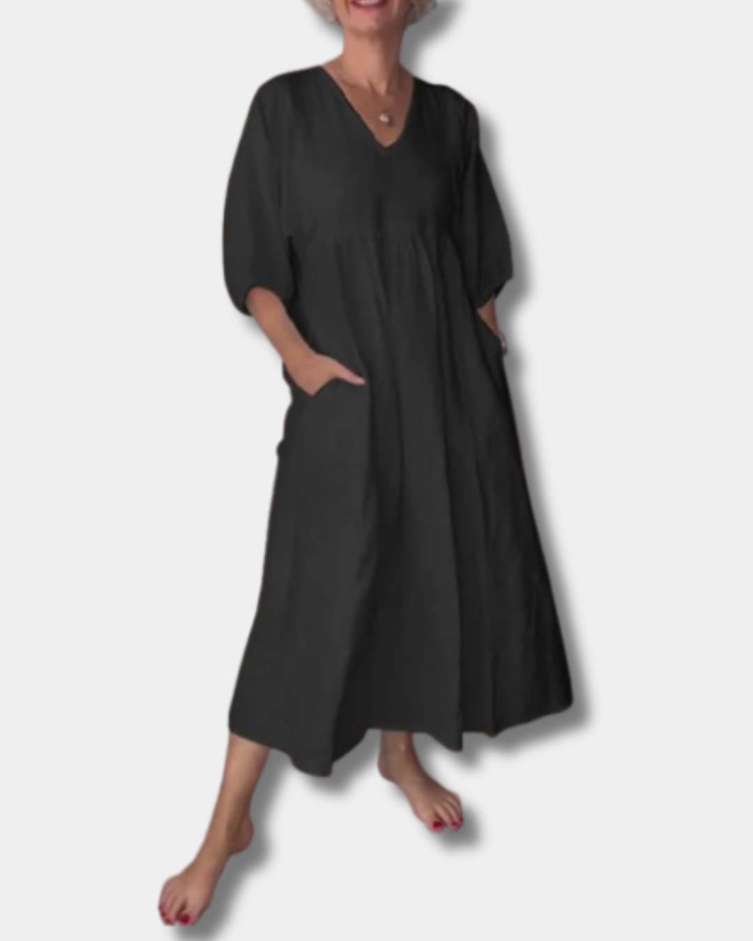 Step into laid-back style with the Sammy Dress – a soft, breathable piece designed for women who love comfort without compromising on charm. With a flattering V-neck, mid-length sleeves, and a relaxed silhouette that gently skims your curves, it flatters your natural shape without feeling tight. Perfect for coffee runs, lunch dates, or weekend getaways, this dress is easy to wear, easy to love, and made for real life.